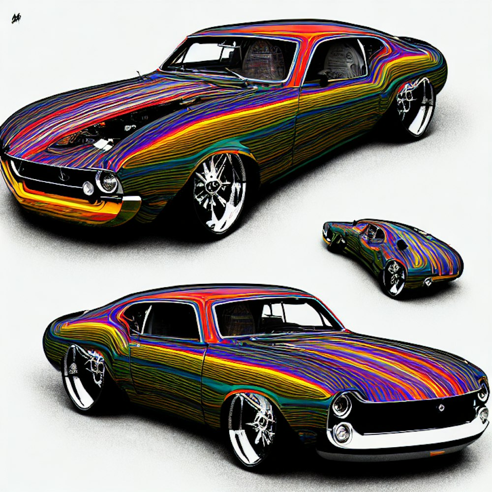 1970's style album art colorful fastback hotrod burnout