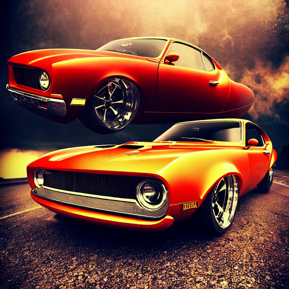 1970's style album art vibrant fastback hotrod burnout