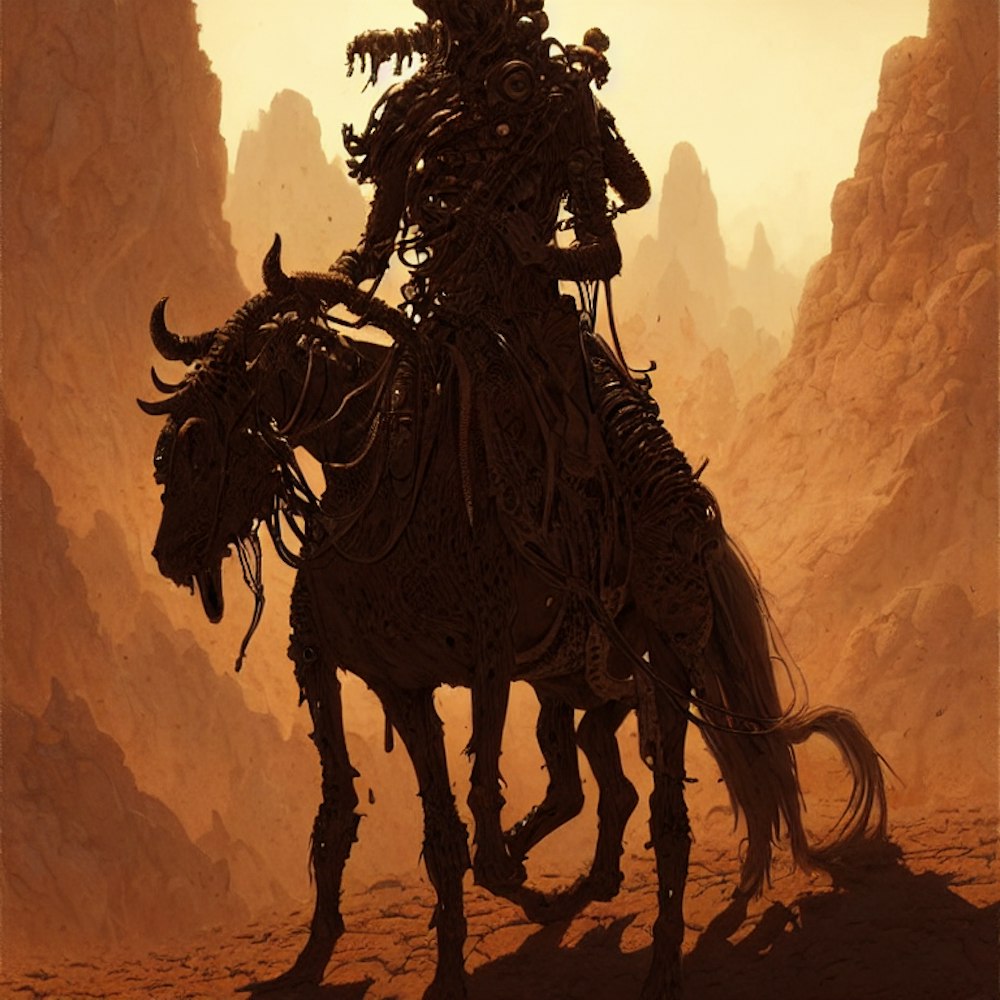 a portrait of a cowboy demon fantasy character portrait, desert alien planet, ultra realistic, cinematic, concept art, wide angle, intricate details, hologram, highly detailed by greg rutkowski, aaron horkey, gaston bussiere, craig mullins, simon bisley,