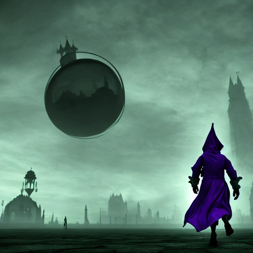 jester silhouette walking away towards a giant hourglass in the middle of a vast wasteland. green and purple tint.