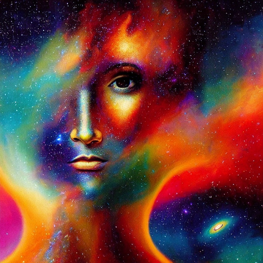 beautiful human face gently transforming into a time/space rift made of beautiful colors and revealing a lush galaxy beneath it; all painted in the style of a 1970's progressive rock album cover