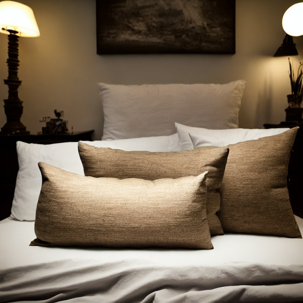 one simple pillow in a large bed, text on pillow "Granluar Echoes", lofi style,