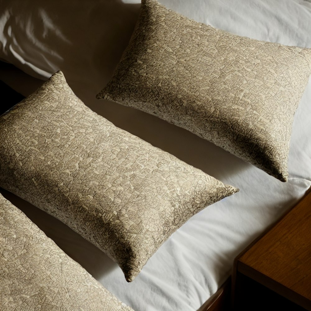 one simple pillow in a large bed, text on pillow "Granluar Echoes", lofi style,
