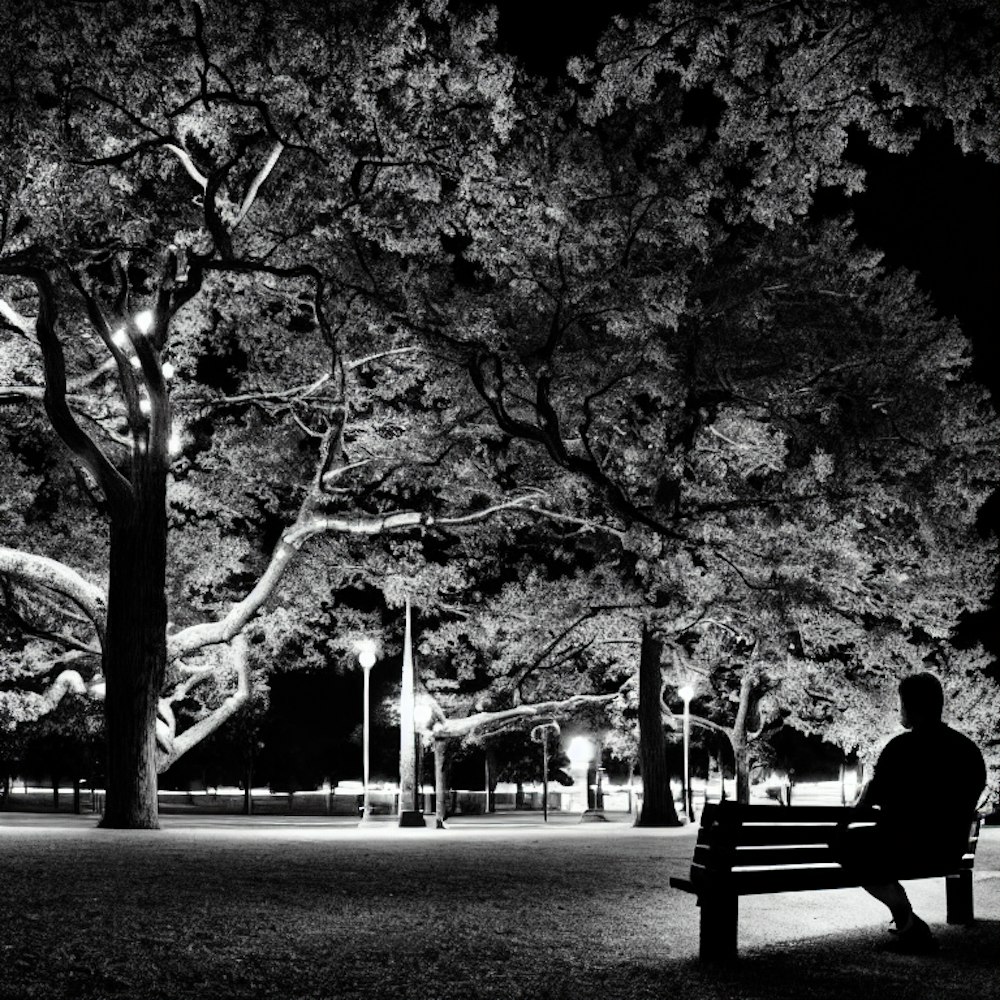 A black and white photo of a man sitting on a bench at a park at night with trees aroundÂ