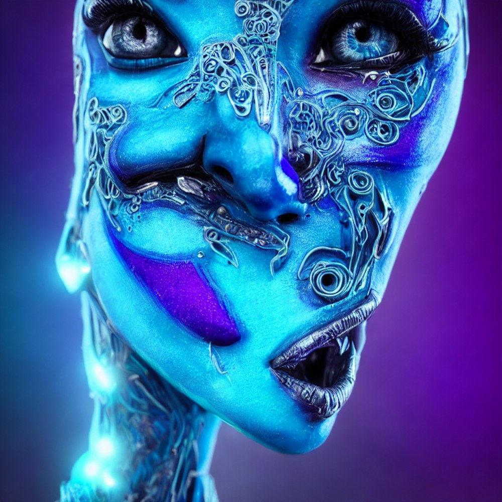 light humanoid blue and purple and turquoise one face happy loving