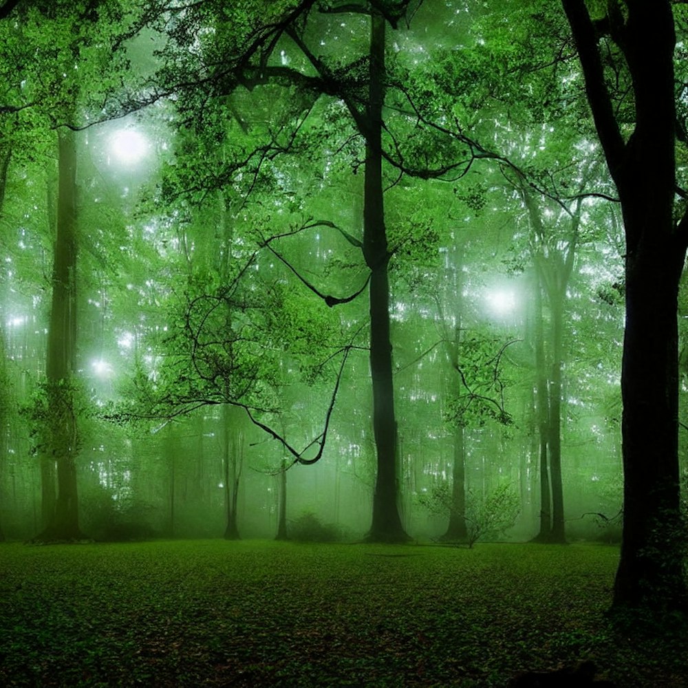 An ethereal forest grove bathed in a soft, magical glow. Moonlight filters through the dense canopy, casting shimmering patterns on the forest floor. Mystical creatures are in between the trees. In the center of the grove is a smoky river, its surface reflecting the moonlight. The air is filled with the soft rustling of leaves and the scent of blooming flowers. The overall atmosphere is enchanting and beautiful, with a sense of both wonder and mystery.