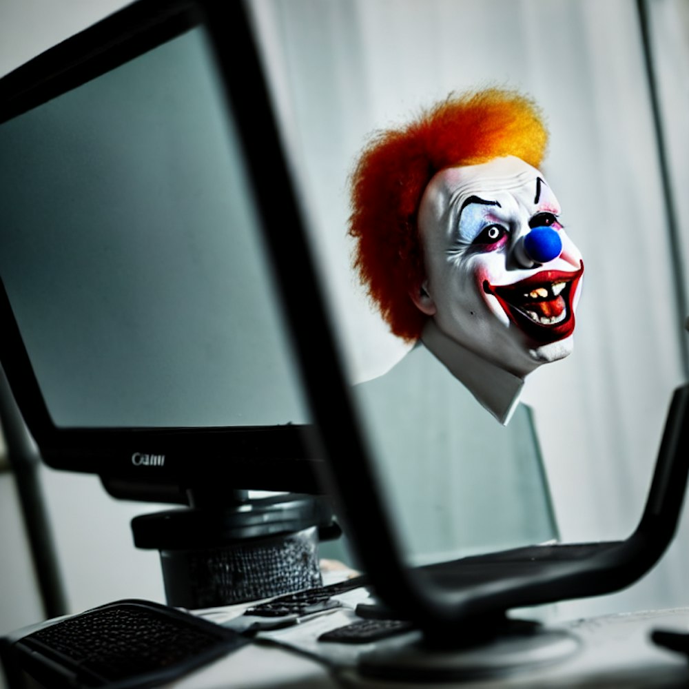reflection of nefarious clown on old computer monitor trolling the internet