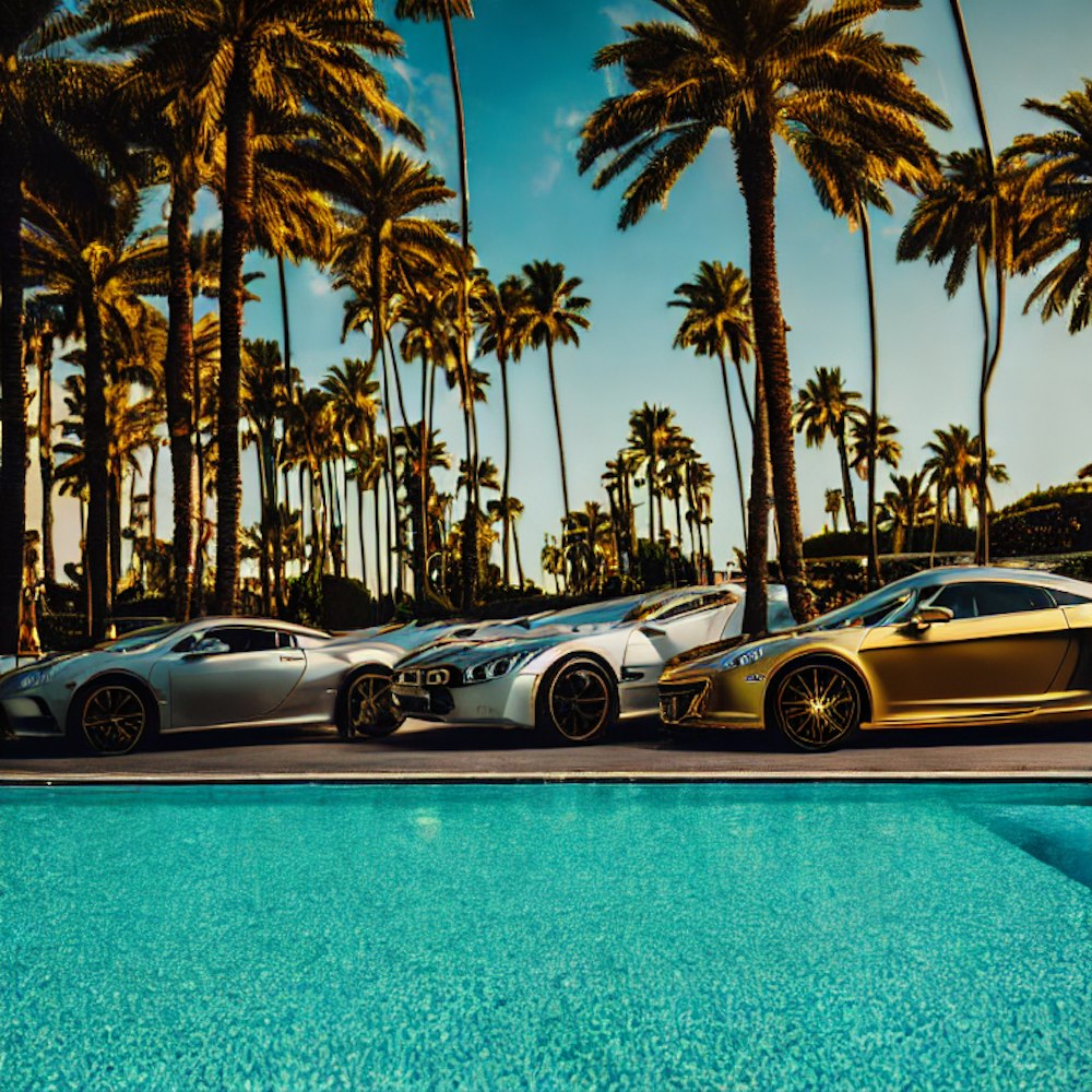 Luxury cars near a pool, palm trees with gold leaves