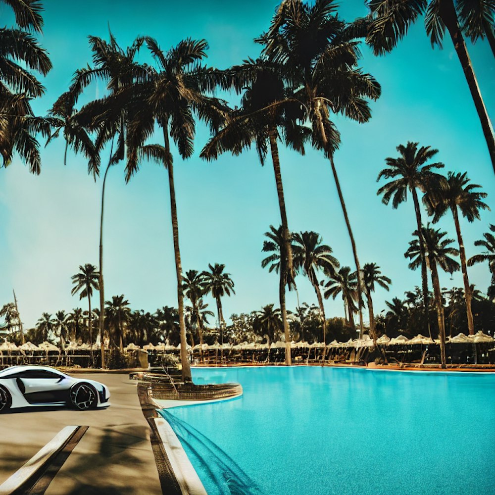 Luxury cars near a pool, palm trees with gold leaves