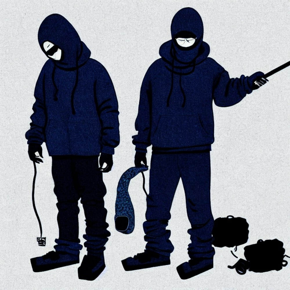 dark blue drawing of a single, one, singular cool rapper with ski mask who is smoking and has cool clothes in the night next to the river for song cover