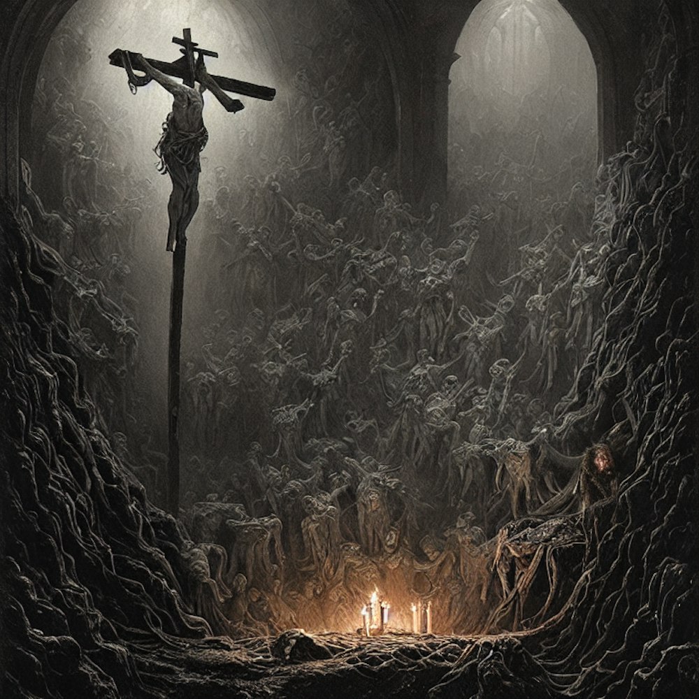 A dead god hanging from a cross in hell