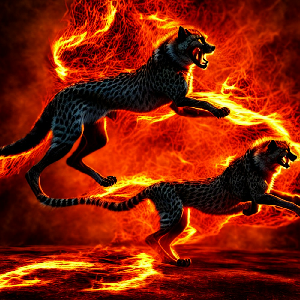 Fiery cheetah fighting a black, fiery wolf, leaving scratch marks on the wolf