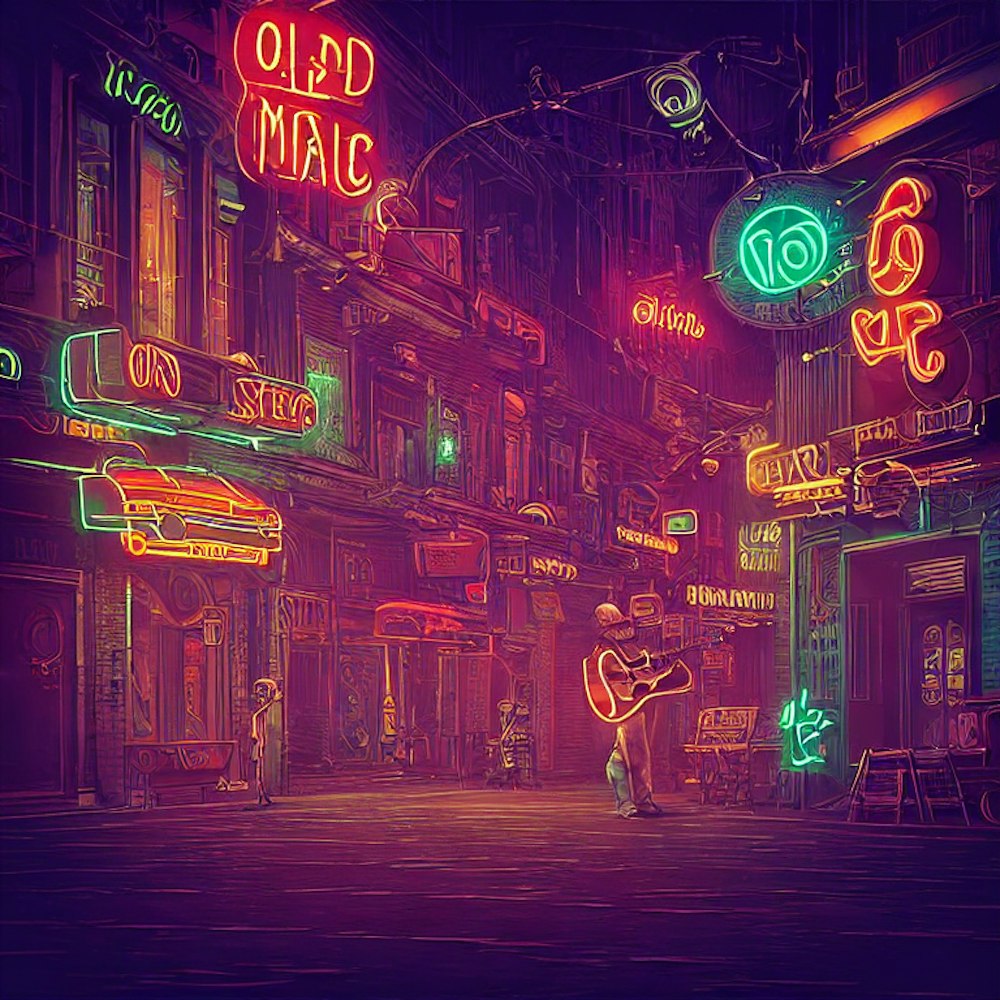 old musician in street neon dreams.