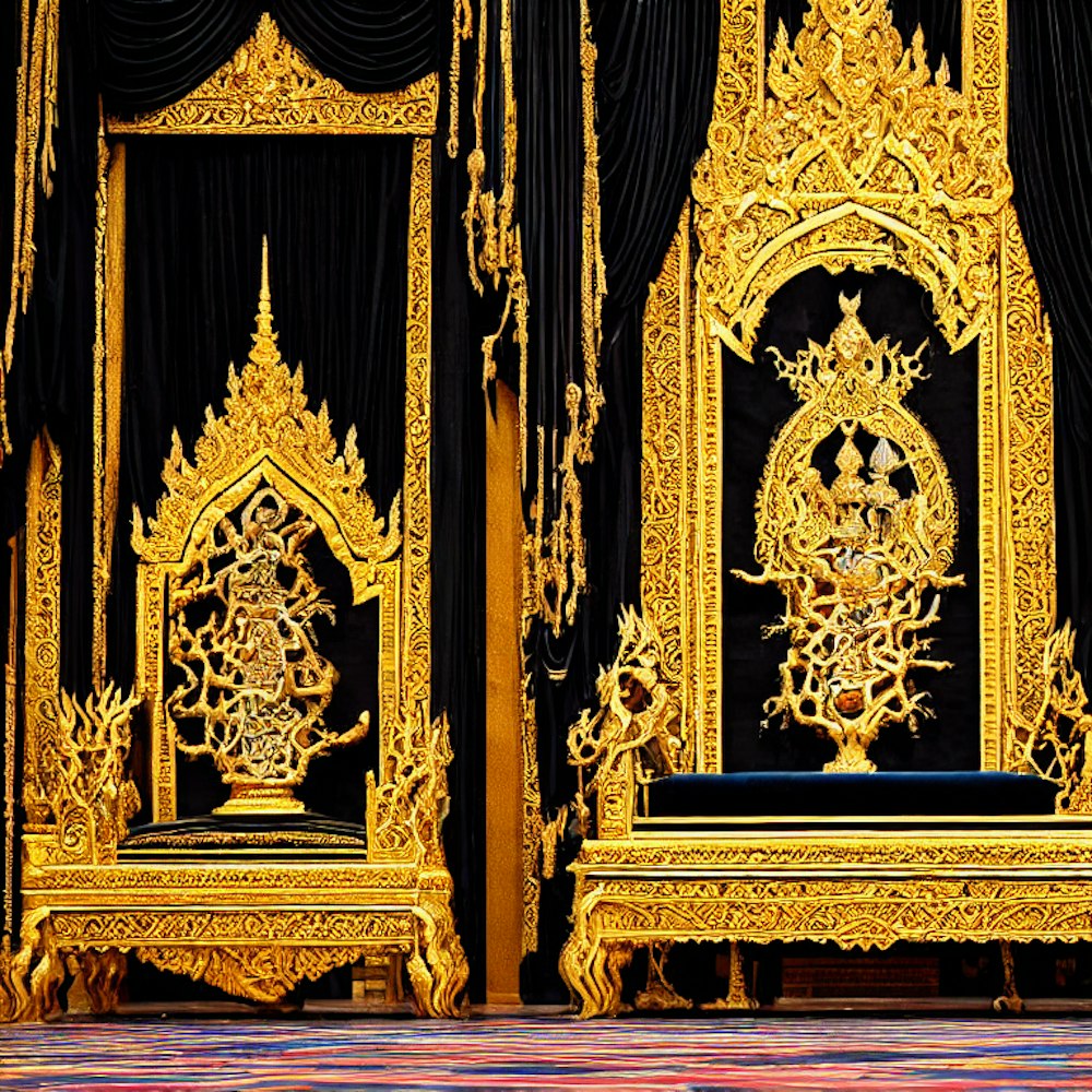 In the grand palace's throne room, a magnificent ebony throne stands atop a dais, adorned with intricate carvings of ancient symbols and motifs. Seated upon it is the black king, regal and dignified, draped in robes of deepest indigo and gold. Sunlight filters through stained glass windows, casting a kaleidoscope of colors across the marble floor. The air is filled with the scent of polished wood and burning incense, adding to the atmosphere of majesty and power that permeates the chamber. Courtiers bow low before their sovereign, their whispers echoing softly against the vaulted ceilings. Outside, the palace walls rise high, shielding this kingdom's ruler from the world beyond, while within, the king commands with wisdom and authority, ruling over his realm with grace and strength.