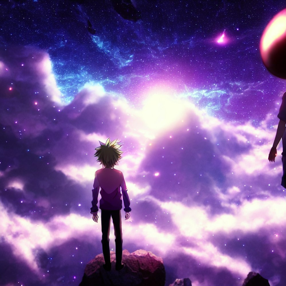 anime boy standing on an astroid looking down on the galaxy purple anime style