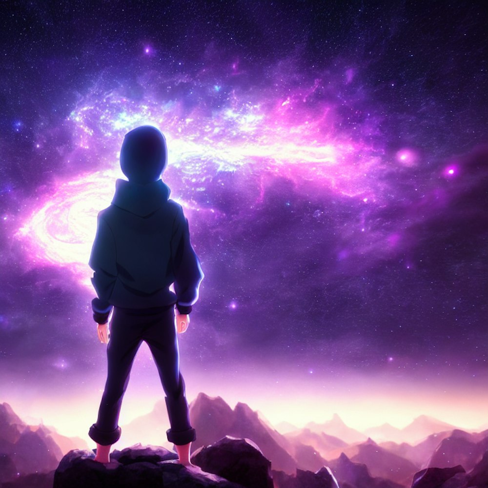 anime boy in a hoodie standing on an astroid looking down on the galaxy purple anime style