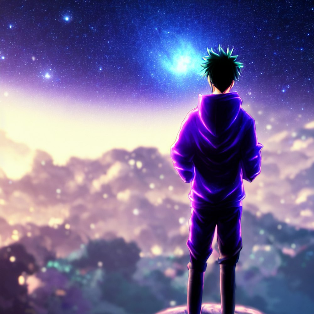 anime boy in a hoodie standing on an astroid looking down on the galaxy purple and blue anime style