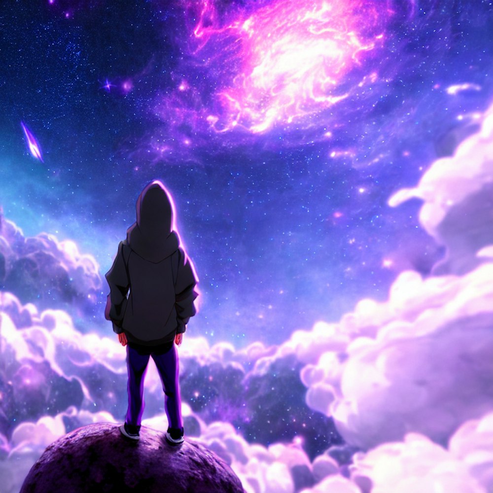 anime boy in a hoodie standing on an astroid looking down on the galaxy purple and blue anime style