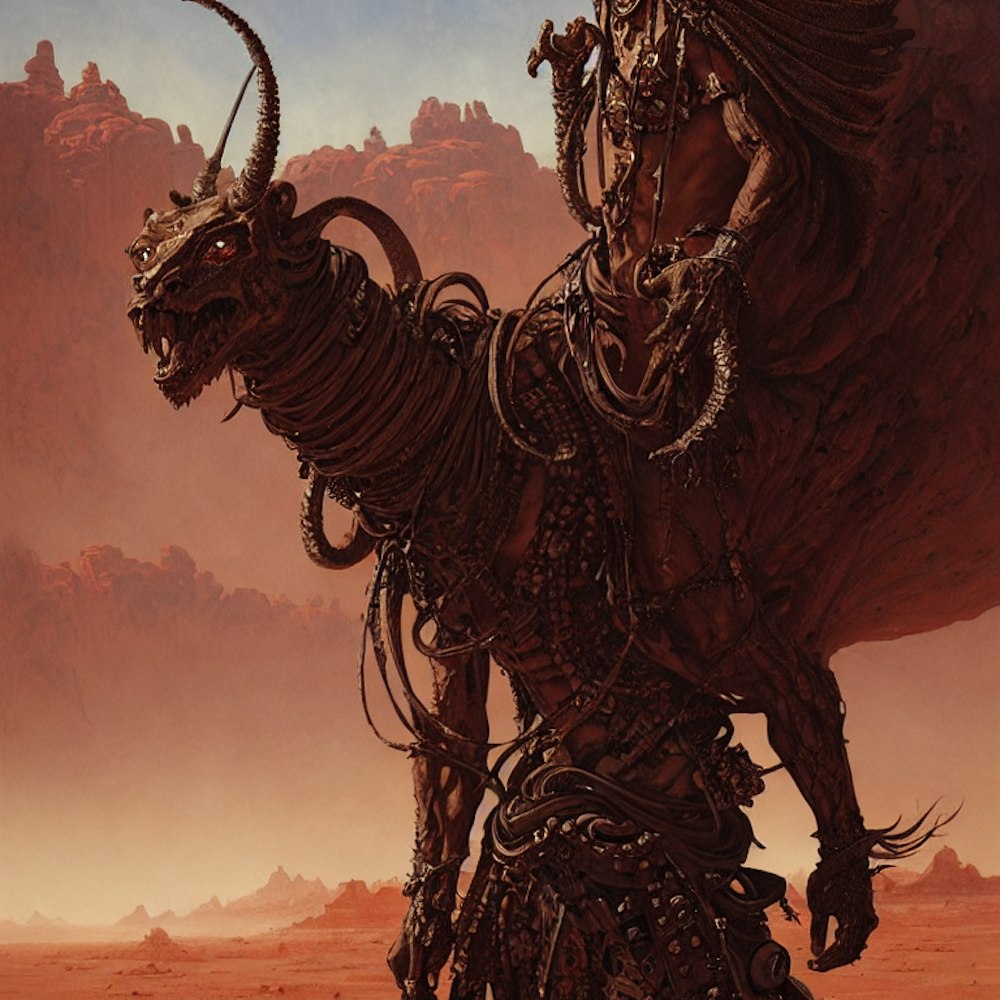 a portrait of a cowboy demon fantasy character portrait, desert alien planet, ultra realistic, cinematic, concept art, wide angle, intricate details, hologram, highly detailed by greg rutkowski, aaron horkey, gaston bussiere, craig mullins, simon bisley,