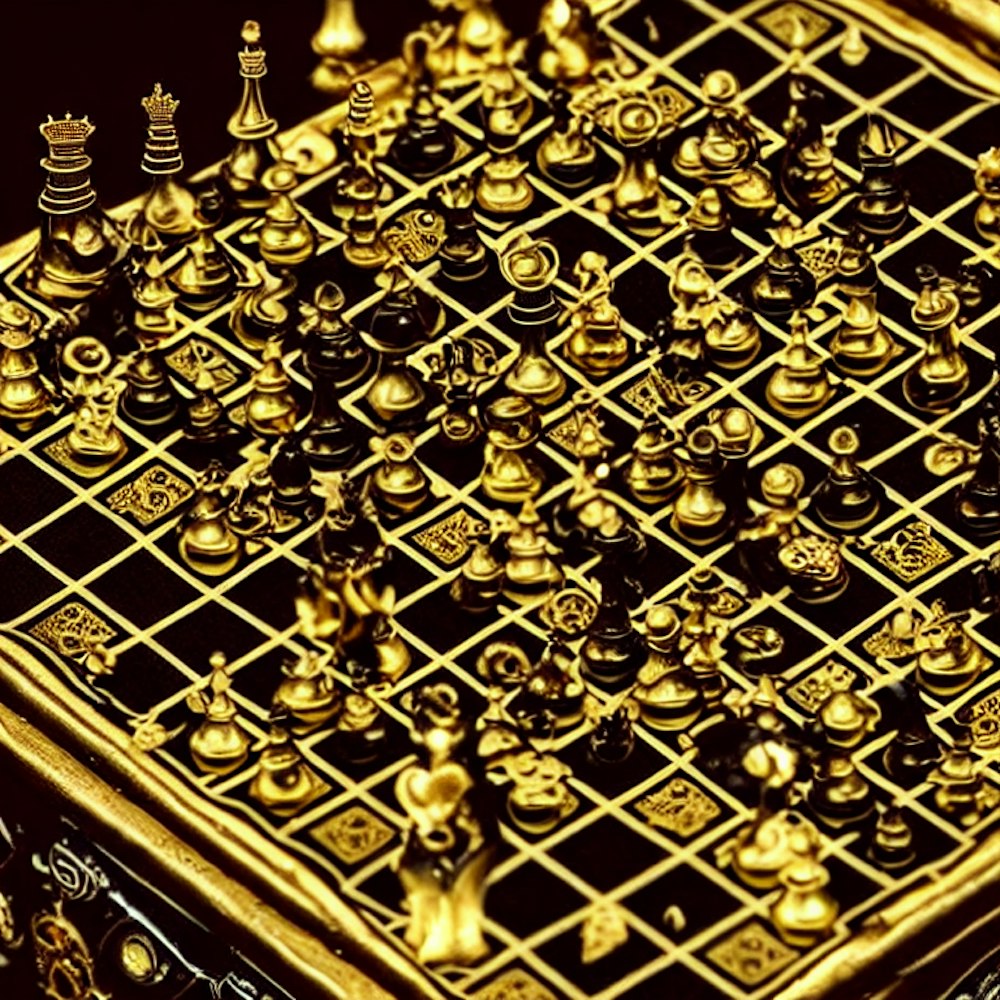 a steampunk chessboard made of gold. with money and jewelry