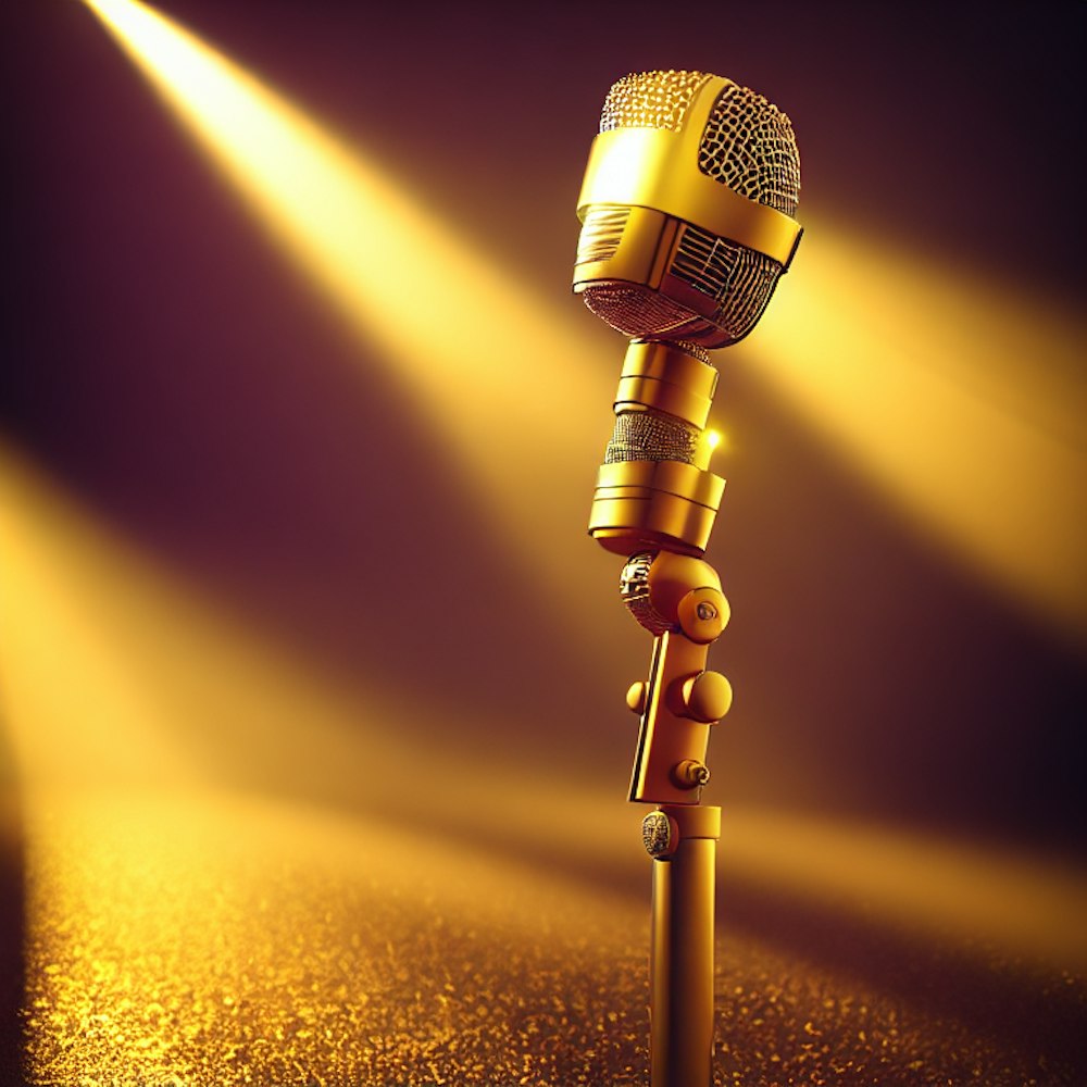 a golden microphone from the 50's with sun beams shining down from the heavens on it. in a melting arena