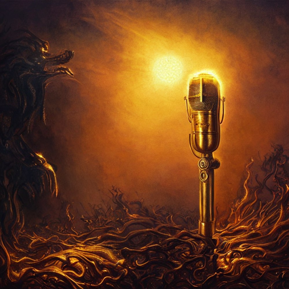 a golden microphone from the 50's with sun beams shining down on it from the heavens surrounded by fire photorealistic