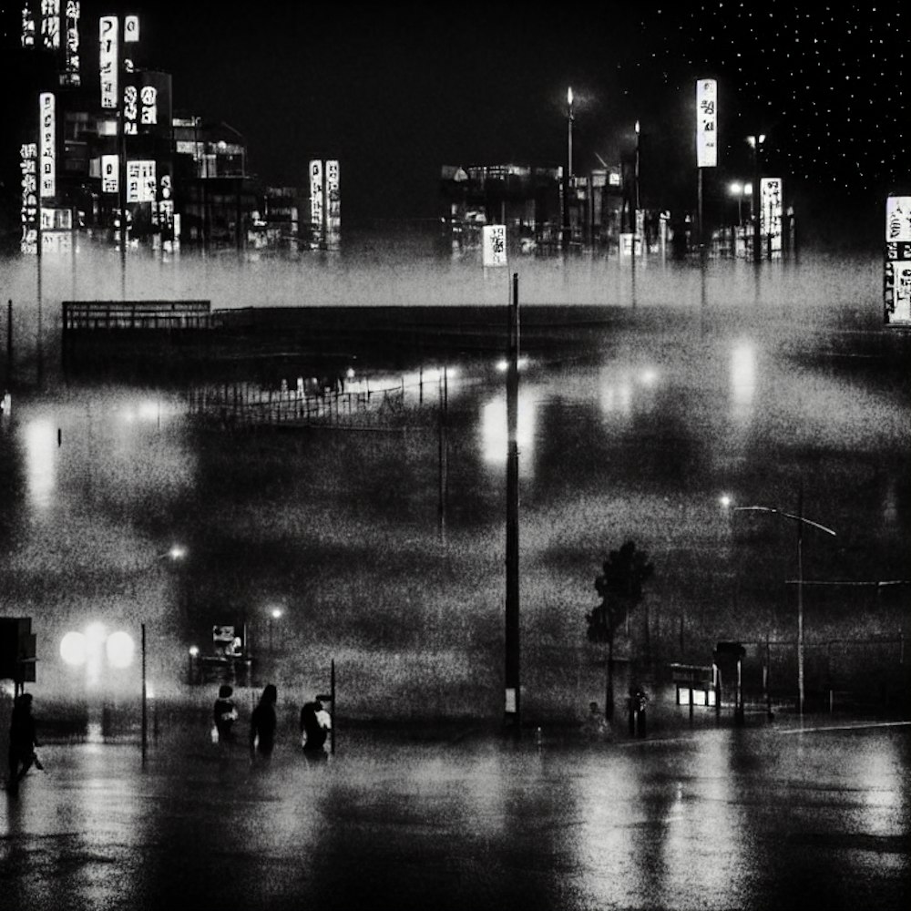 Osaka, 4 am, Sobeks walking home from distant factory, fog, citywide blackout, tilt-shift, moonlit cityscape photography, nocturnal photography, textured lighting effects, no cars, no streetlights, only illumination from moon and stars, contemplative Sobek in foreground in bokeh, Gaussian selective blurs --ar 3:4 --weird 160 --v 6.0 - @trianglefruitbat (fast)