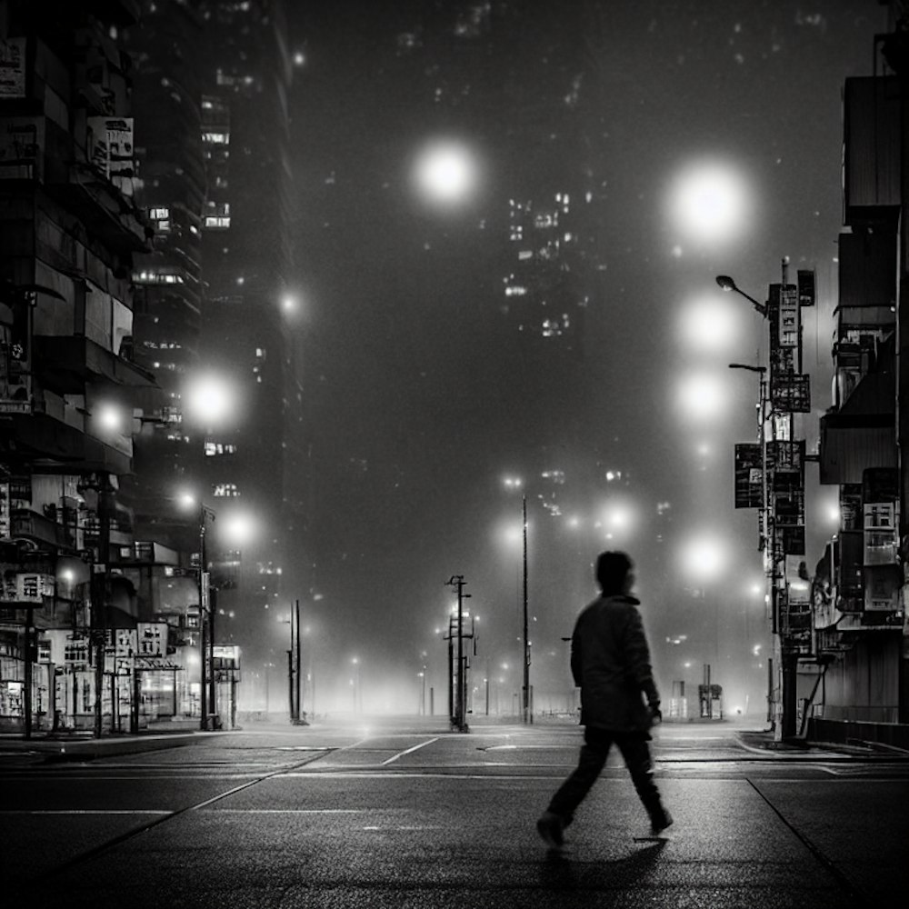 Osaka, 4 am, Sobeks walking home from distant factory, fog, citywide blackout, tilt-shift, moonlit cityscape photography, nocturnal photography, textured lighting effects, no cars, no streetlights, only illumination from moon and stars, contemplative Sobek in foreground in bokeh, Gaussian selective blurs --ar 3:4 --weird 160 --v 6.0 - @trianglefruitbat (fast)
