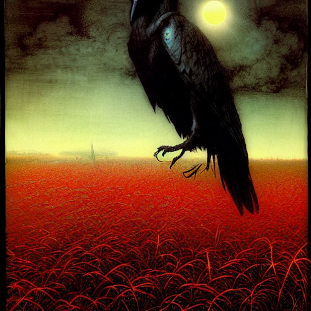 Raven, eclipse, red sky, farm, horror, cornfield, by Ayami Kojima, beksinski, Amano, Francisco Goya, Beksinski painting, Adrian Ghenie, Takato Yamamoto. Greg Rutkows, detailed, classicism, intricate, detailed. jean pierre ugarte, albert bierstadt, karl he