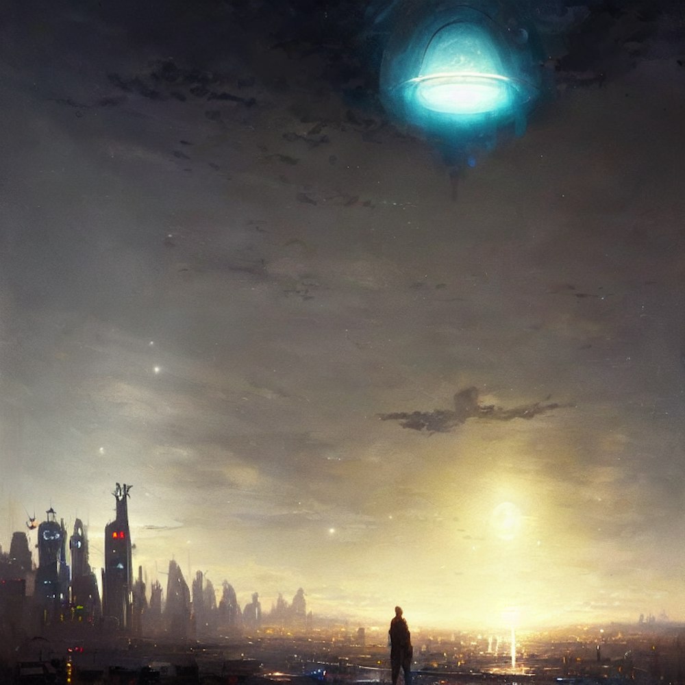 an american city skyline at night, with a alien UFO in the sky