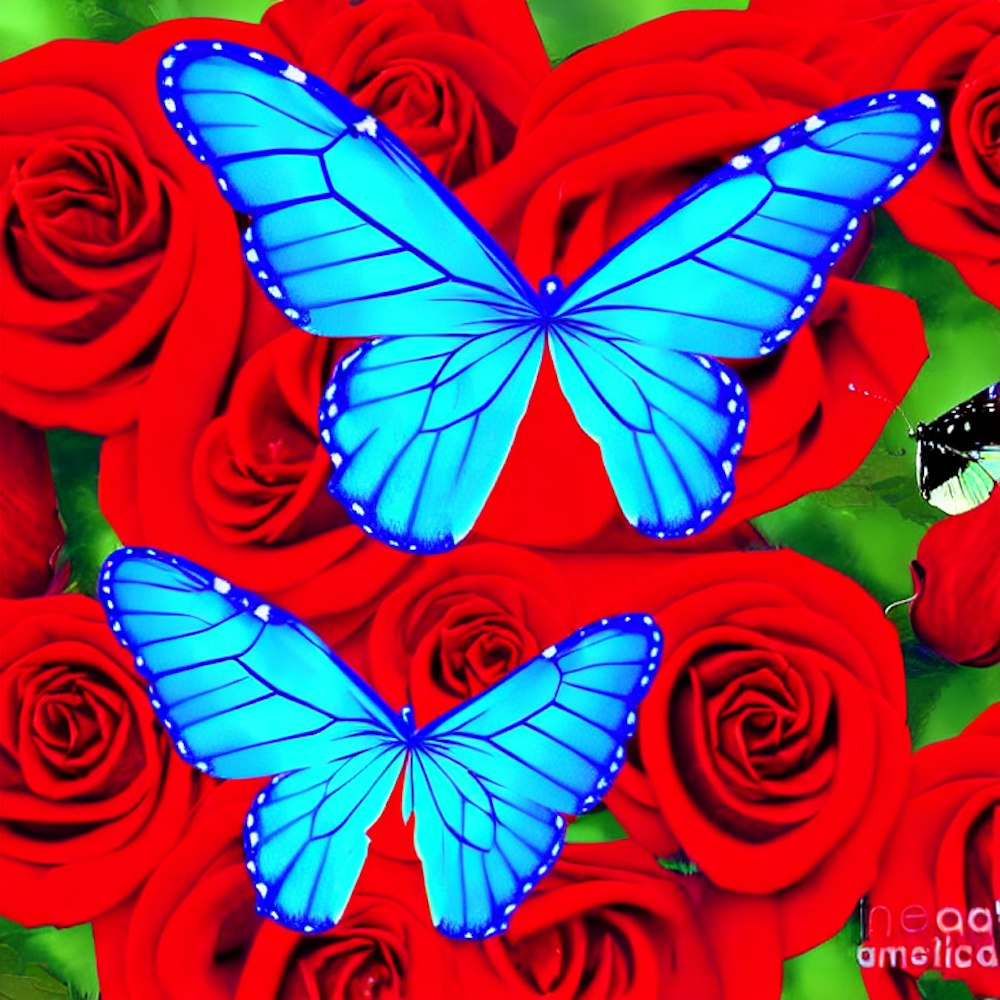 one big Blue butterfly spread wings in the bottom red roses digital art