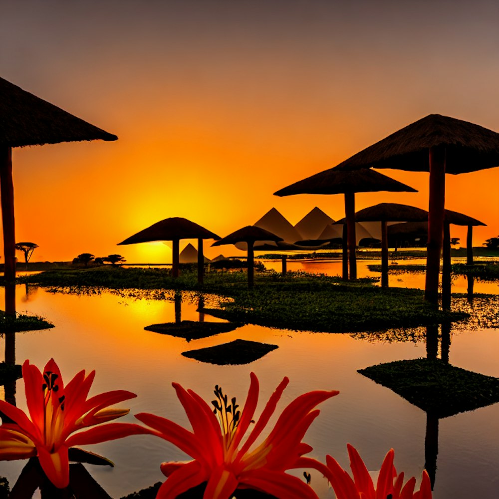 African pyramids and orange sunrise with lillies in water