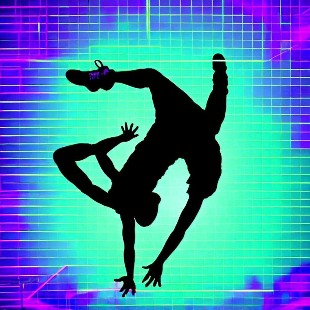 Male break dancer silhouette on 80’s colourful neon grid lines 4k, hd.