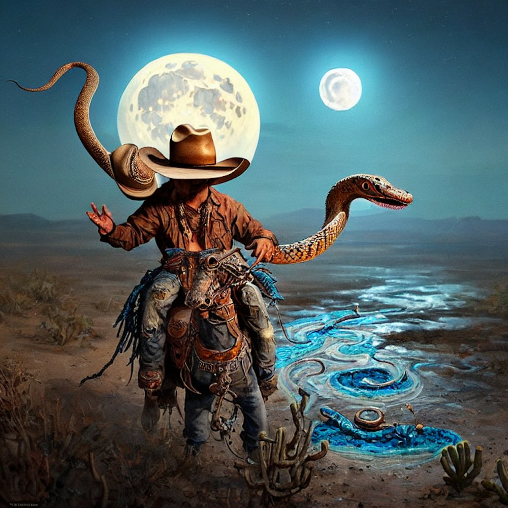 Cartoon rattlesnake with a cowboy hat on in the desert with the full moon in the background�