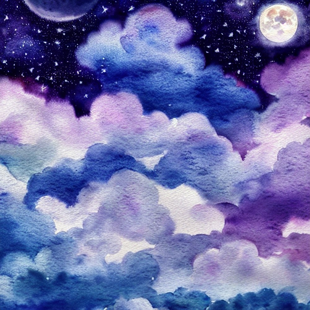 Watercolor sky, full moon, lots of clouds, stars, watercolor