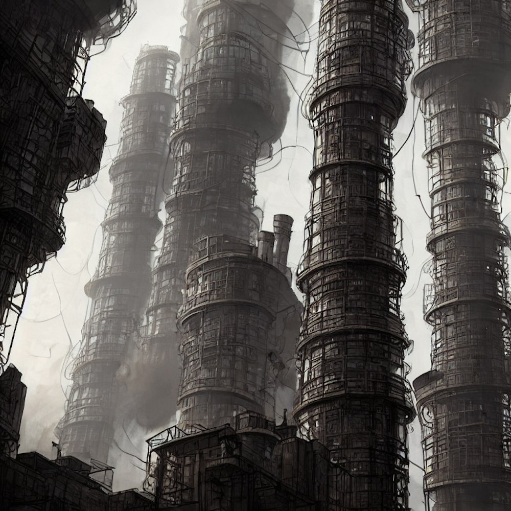 Dystopian city smoke stacks fire