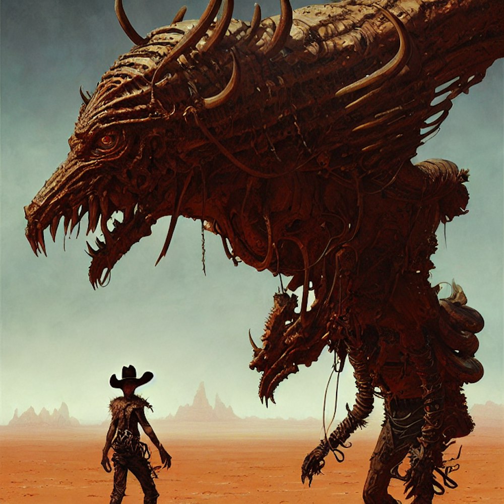 a portrait of a cowboy demon fantasy character portrait, desert alien planet, ultra realistic, cinematic, concept art, wide angle, intricate details, hologram, highly detailed by greg rutkowski, aaron horkey, gaston bussiere, craig mullins, simon bisley,