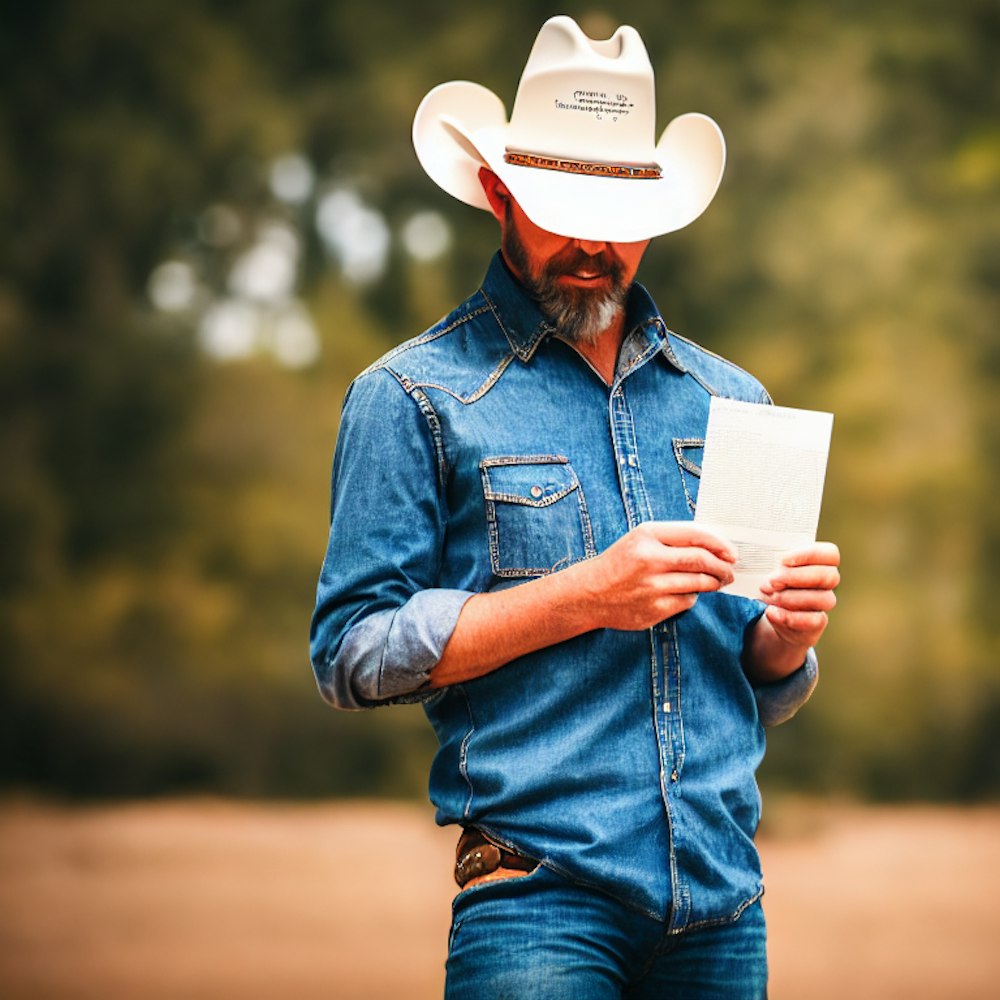 side of a man wearing a cowboy hat, holding a postcard in his hand