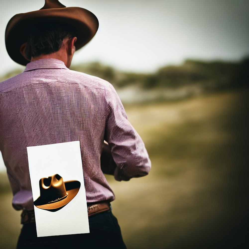 back view of a man wearing a cowboy hat, holding a postcard in his hand