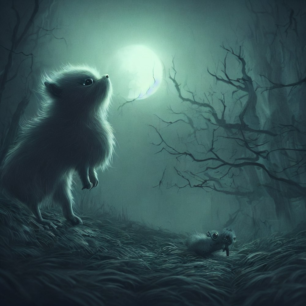 Small cute creature looking at a huge scary soul in the night