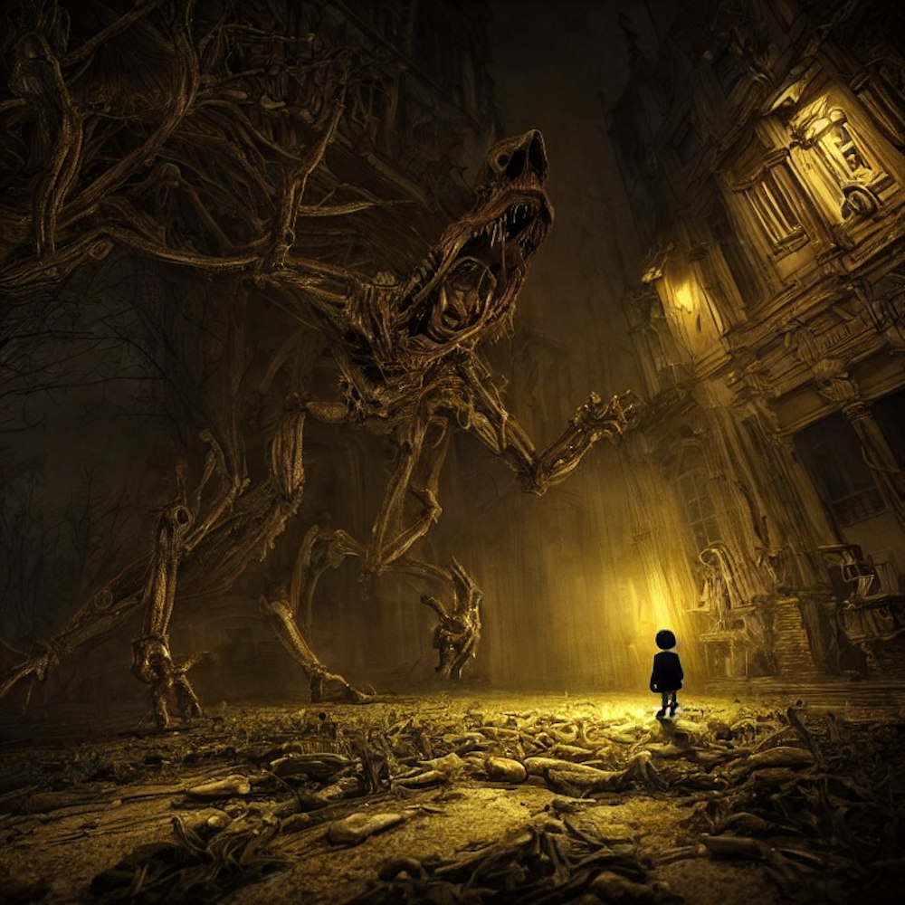One small guy looking at a huge scary ghost in the night