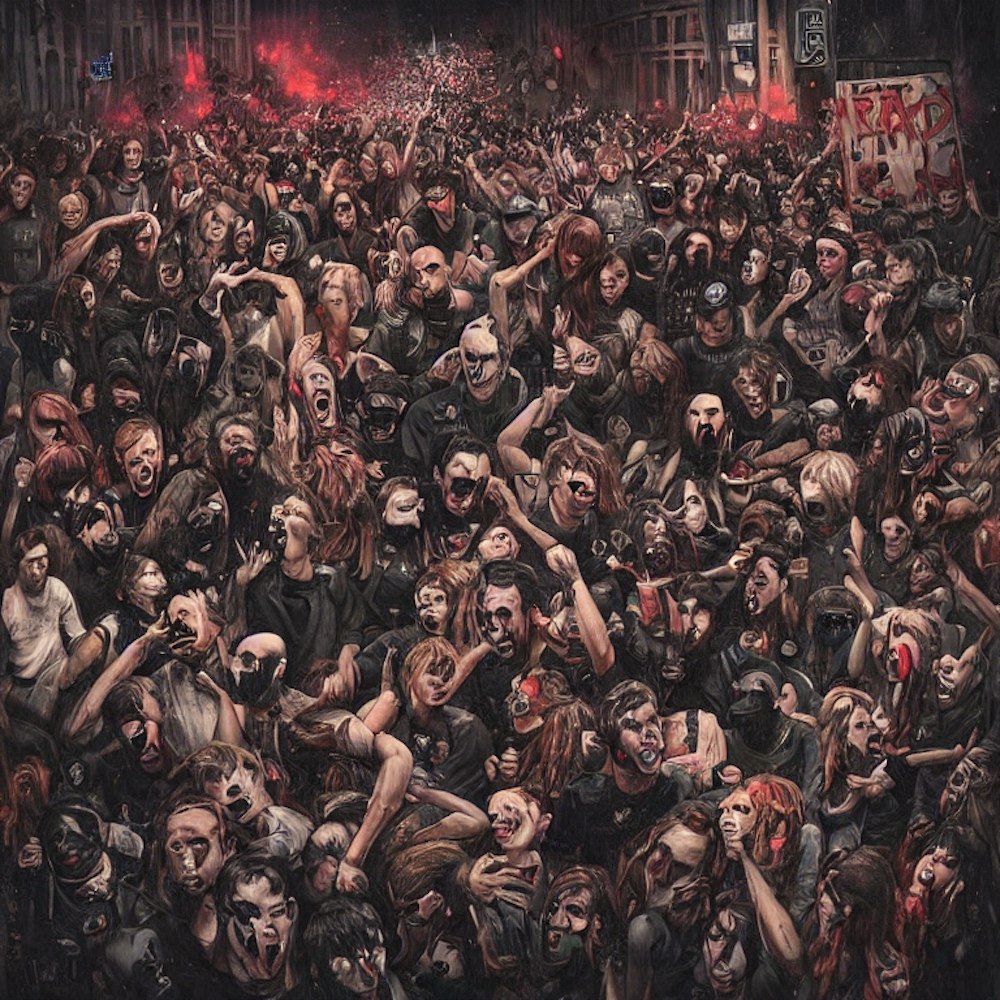 an album cover thats kind of grim but its about a riot, dont have SO many people in it but also have a concert happening in the background, make it say "start a riot" somewhere on the screen