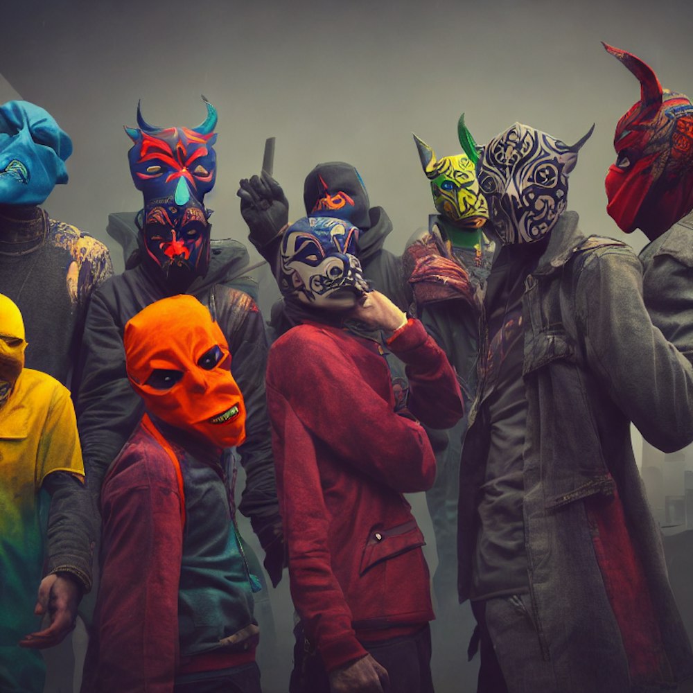 have a photo of a gang in colorful masks but the world looks grey with money falling but it looks realistic