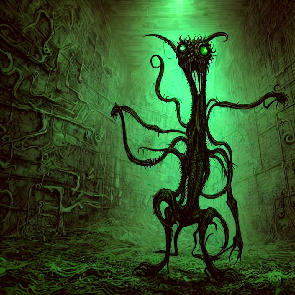 a disgusting eldritch style creature, realistic, standing in front of a grungy green wall