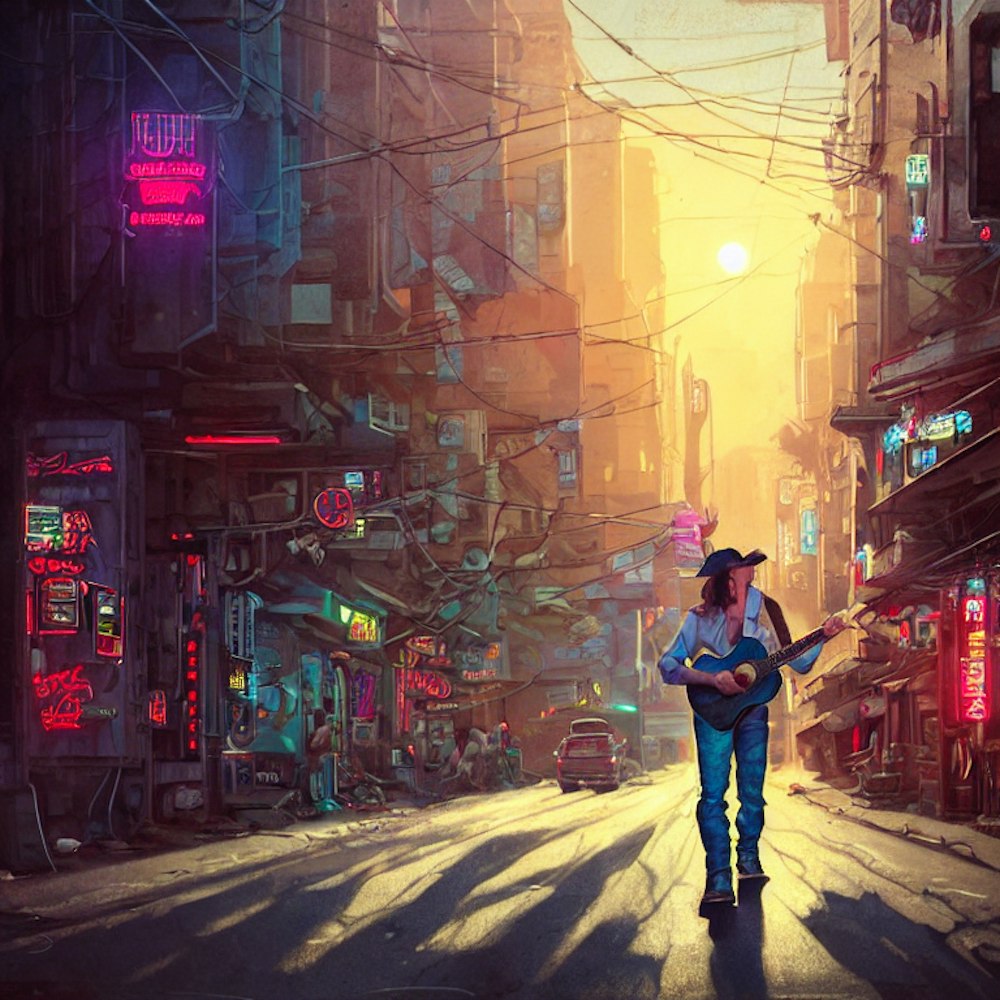 Country Streets:"A high-definition, 8K image of a country artist strolling down a bustling city street, guitar slung over his shoulder. The mix of rural charm and urban edge symbolizes the fusion of country and hip-hop."