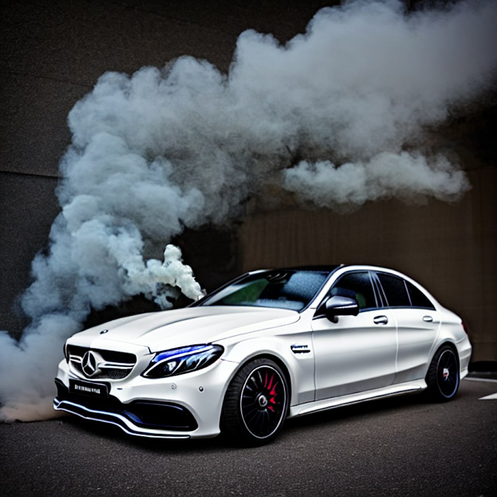 Mercedes c63 with headlights on in the dark, and smoke emerging from the back of the car