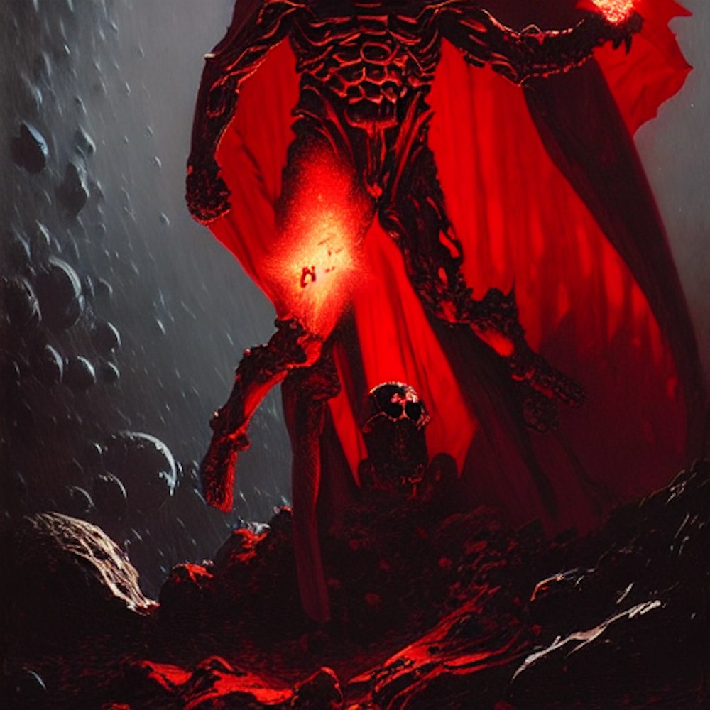 Doom skull face, red cape, Gods of creation, heaven, surreal, space, light rays, galaxy, space, stars, comet, horror Gustave Doré Greg Rutkowski,