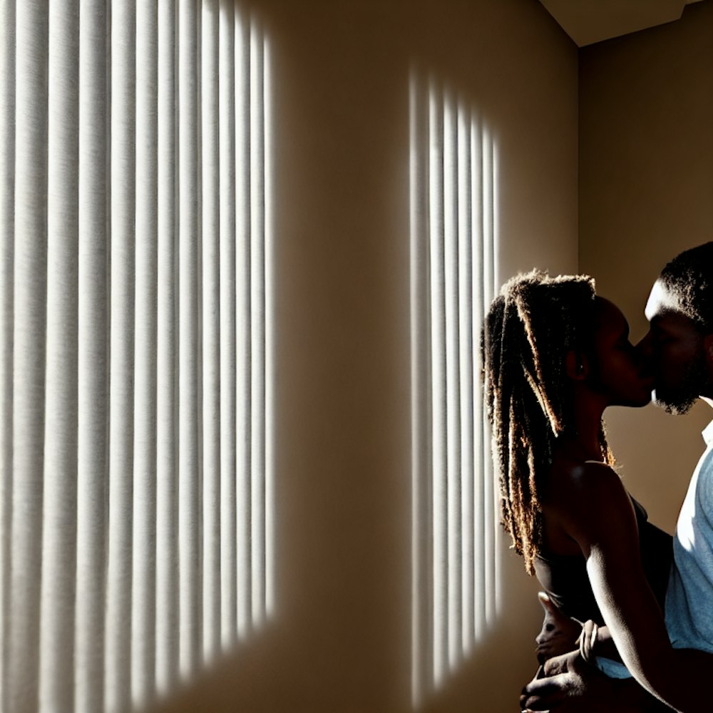 window blinds with shadow of african american couple kissing