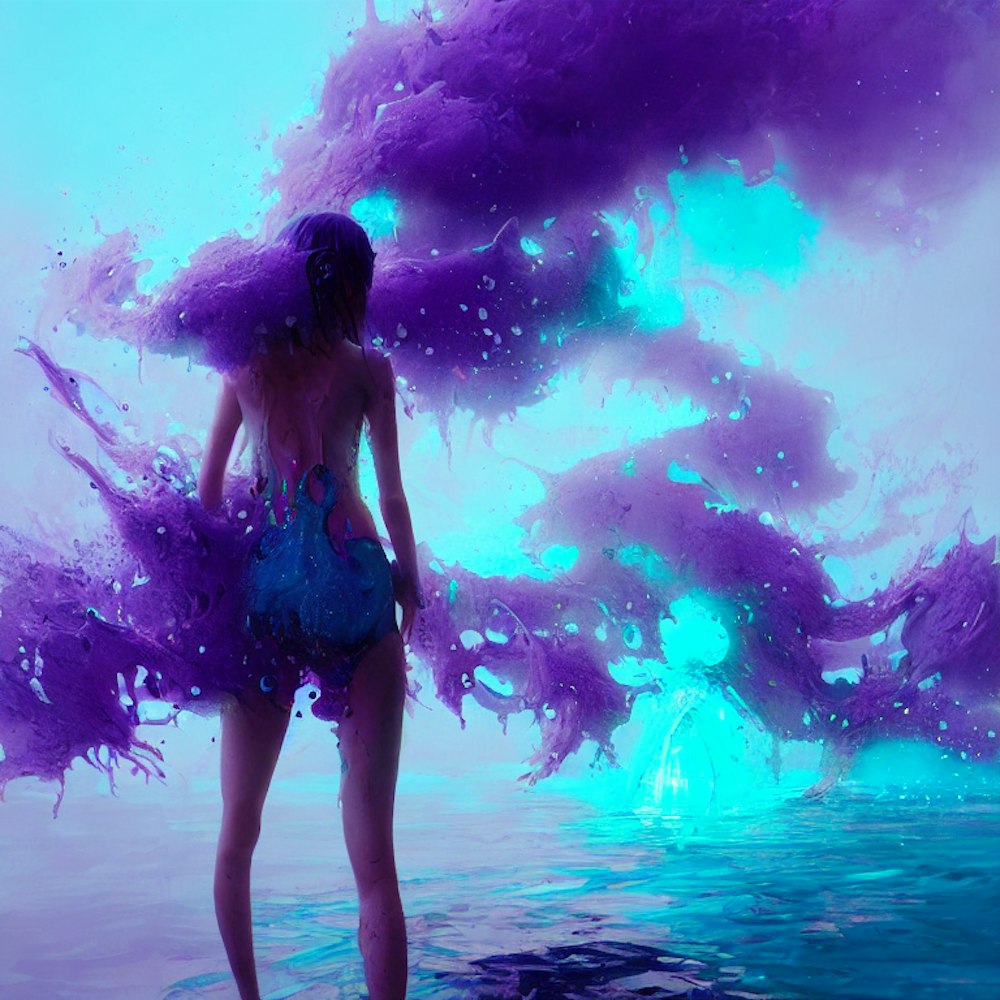 girl with a purple blue backround for a phonk cover, add a water splashes and dynamics, add fog and glitch