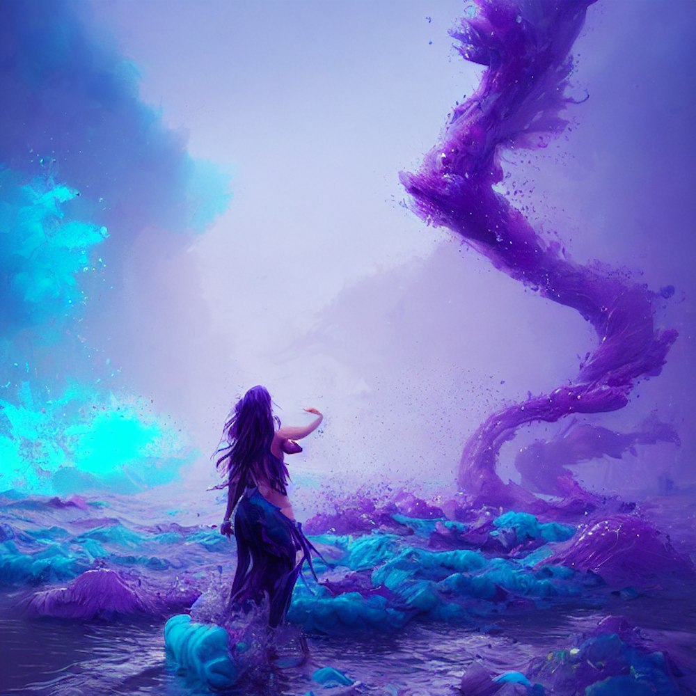 girl with a purple blue backround for a phonk cover, add a water splashes and dynamics, add fog and glitch